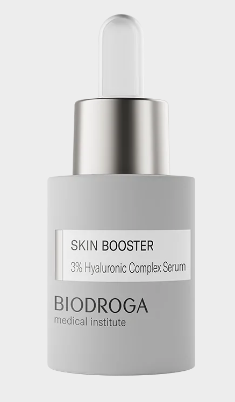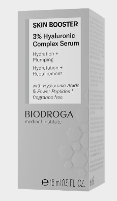 BIODROGA Medical Institute SKIN BOOSTER 3% Hyaluronic Complex Serum stands for maximum hydration with a depot effect. Four hyaluronic acids act synergistically in different layers of the skin, protecting it from moisture loss, activating hyaluronic acid synthesis, promoting elasticity and plumping the skin.Up to 37% plumper skin*