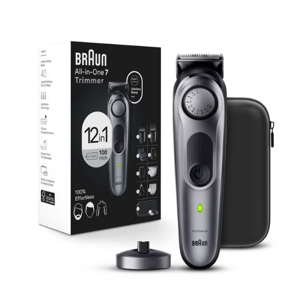 This trimmer for men has a powerful Li-Ion battery with 100-min cordless runtime, lifetime sharp blades, charging stand and a premium case for storage