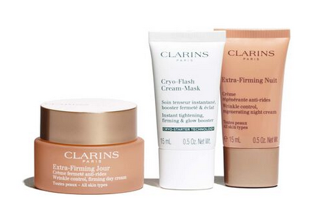 Limited edition 4-piece set of age-defying formulas visibly firms, lifts and fights wrinkles with Extra-Firming Day and Night. Includes Clarins’ ice-cold Cryo-Flash Mask for an instant lift effect, and to minimize pores and revive skin’s radiance fast! Includes an eco-conscious Clarins cosmetics pouch.