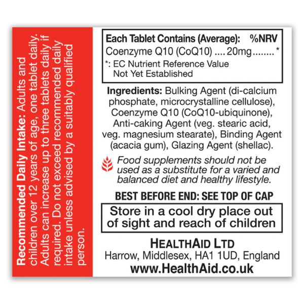 Bulking Agent (di-calcium phosphate, microcrystalline cellulose), Coenzyme Q10 (CoQ10-ubiquinone), Anti-caking Agent (veg. stearic acid, veg. magnesium stearate), Binding Agent (acacia gum), Glazing Agent (shellac).