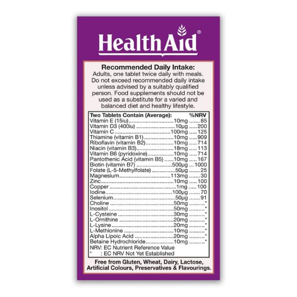 Bulking Agent (microcrystalline cellulose, di-calcium phosphate), Magnesium Oxide, Ascorbic Acid, Vitacholine, Anti-caking Agent (veg. stearic acid, veg. magnesium stearate, silica), Inositol, L-Cysteine, Alpha Lipoic Acid, L-Ornithine, L-Lysine, Zinc Citrate, Coating [hydroxypropyl methylcellulose (HPMC), veg. glycerol], L-Methionine, Niacinamide, Thiamine HCl, D-alpha Tocopheryl Succinate, Pyridoxine HCl, Calcium Pantothenate, Riboflavin, Betaine HCl, Copper Gluconate, D-Biotin, Potassium Iodide, L-5-Methyltetrahydrofolate, L-Selenomethionine, Cholecalciferol (acacia gum, sucrose, sunflower oil, starch).