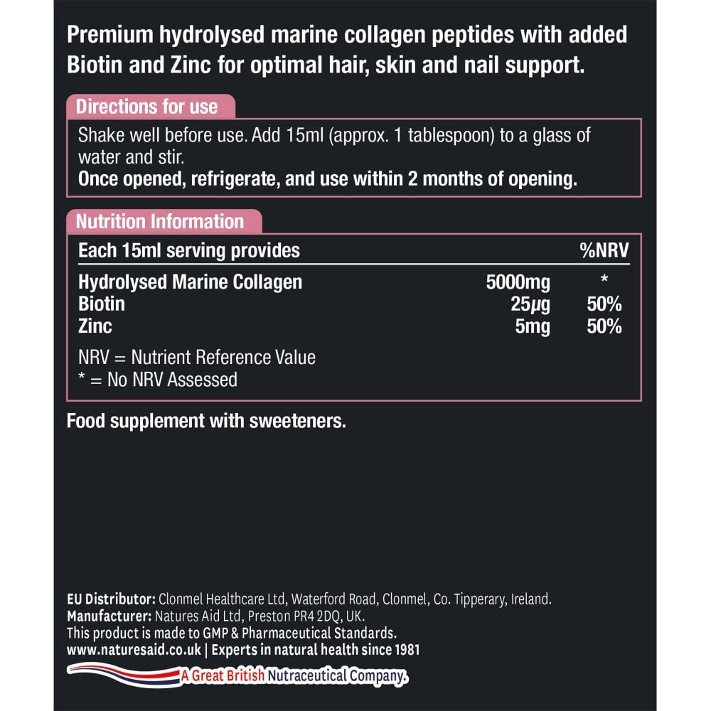 Premium hydrolysed marine collagen peptides with added Biotin and Zinc for optimal hair, skin and nail support. A refreshingly tasty collagen drink with 5g of marine collagen in every tablespoon that can be consumed neat or added to chilled water for a hydrating drink. With added Zinc, Biotin and Citrus Bioflavonoids for optimal hair, skin and nail support.