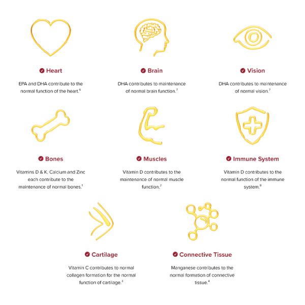 Seven Seas JointCare + CALCIUM has been specifically formulated with Omega-3, Glucosamine, and Chondroitin. Plus, Vitamins C and D, Zinc and Manganese to provide 4-in-1 JointCare Support¹⁻⁴. It supports 4 important components of your joints: Bones¹, Muscles², Cartilage³, and Connective Tissue⁴. It also contains a tailored combination of Calcium, Vitamins D & K to support the maintenance of normal bones¹. Like all the products in our JointCare range, Seven Seas JointCare + CALCIUM helps to support an active lifestyle ¹⁻⁴. With Premium Omega-3⁵ to help support healthy Heart⁶, Brain⁷ and Eyes⁷.