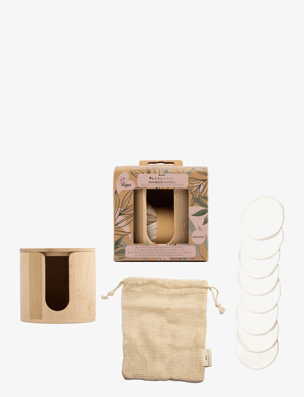 STYLPRO BAM.BARREL BAMBOO BARREL MAKE UP REMOVER PADS IN LAUNDRY BAG