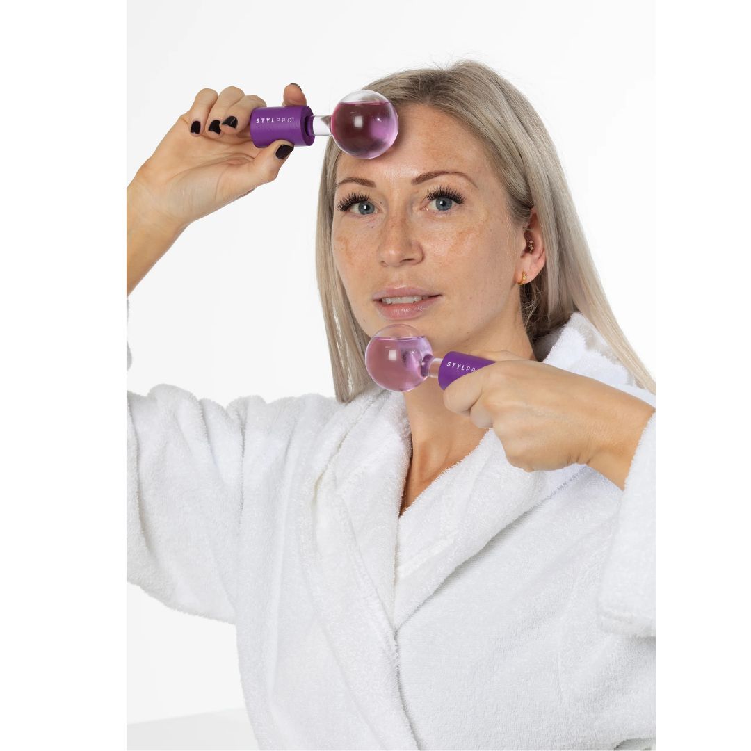 STYLPRO Ice Globes are a set of 2 cryotherapy facial massage rollers, using the cooling powers of icy temperatures to lift complexion, enhance circulation, reduce eye circles, and drain lymph nodes.